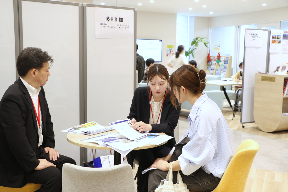 後半は、各プログラムの個別相談が行われ、在学生の留学経験者と本学で単位認定をするプログラムを提供する留学エージェントがブースを訪れた学生の相談に応じました。留学エージェントを利用するISA(本学正規プログラム以外の留学先が選べる海外自主留学)制度は、近年参加学生が増え、短期留学でより多様な体験を出来るようになりました。
