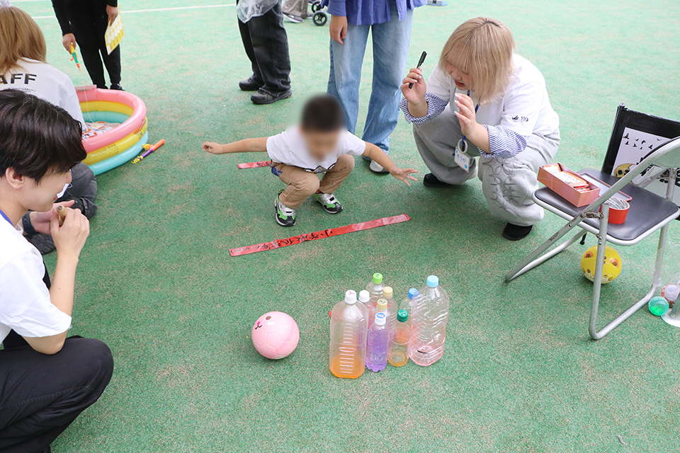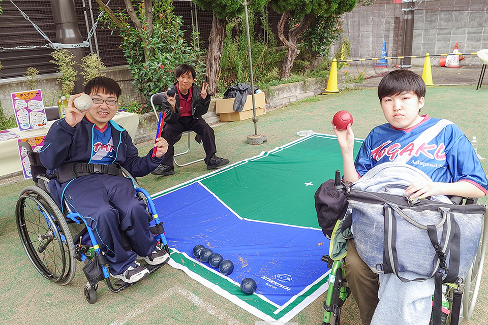 さらに、有志学生の一声から、本学在学中に文京区スポーツボランティアとして活躍していた卒業生2名が協力し、パラスポーツ「ボッチャ」体験ブースの出店も。
