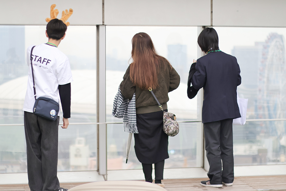 大学生活の様子をお話しながら、屋上やGlobal Loungeなどの施設を紹介しています。
