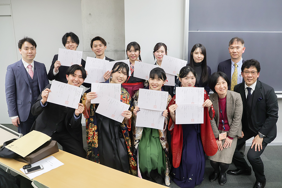 その後、ゼミ別行事にて、指導教員から改めて卒業生一人ひとりに学位記を授与。
