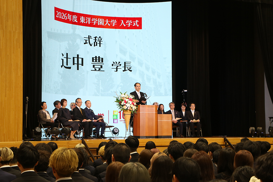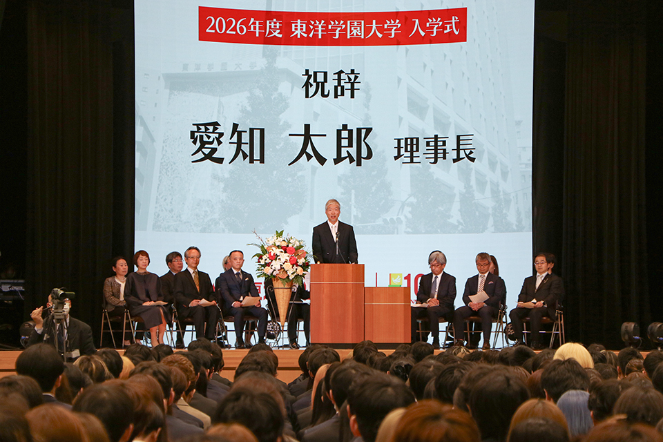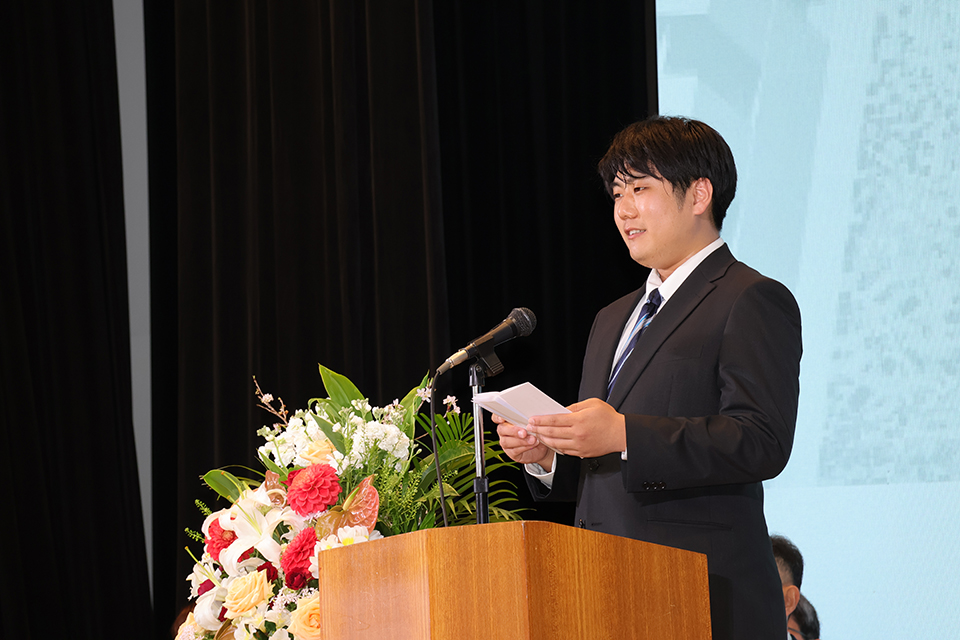 式典では、辻中豊学長の式辞、愛知太郎理事長の祝辞に続き、在学生を代表して学生会長の土井翔太さんから新入生へお祝いの言葉が贈られました。