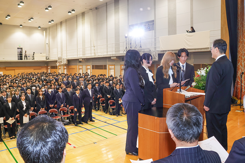 その後、各学部と大学院の代表学生が登壇、辻中学長に対して堂々と宣誓を行いました。