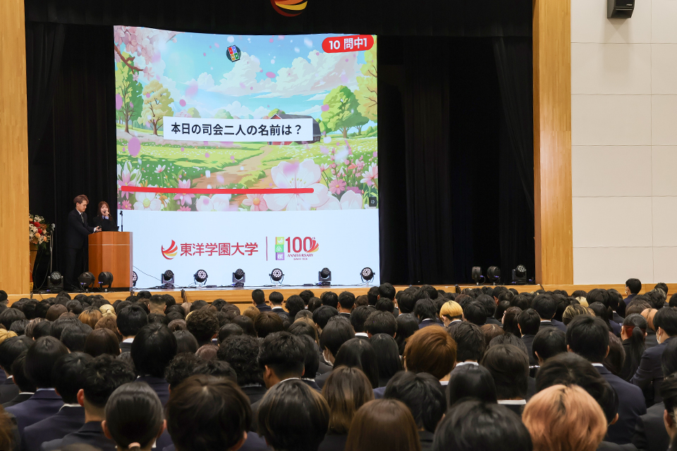 「建学の精神の正しい漢字は?」「学内にある自動販売機の種類は?」など、TOGAKUの細かすぎる情報を集めたクイズが10問出題され、早押しでトップ5位までに入った新入生に学食の無料チケットがプレゼントされました。
