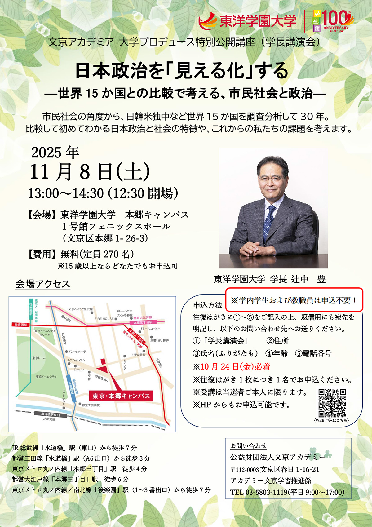 東洋学園大学 辻中学長講演会(文京アカデミア大学プロデュース特別公開講座)【無料】