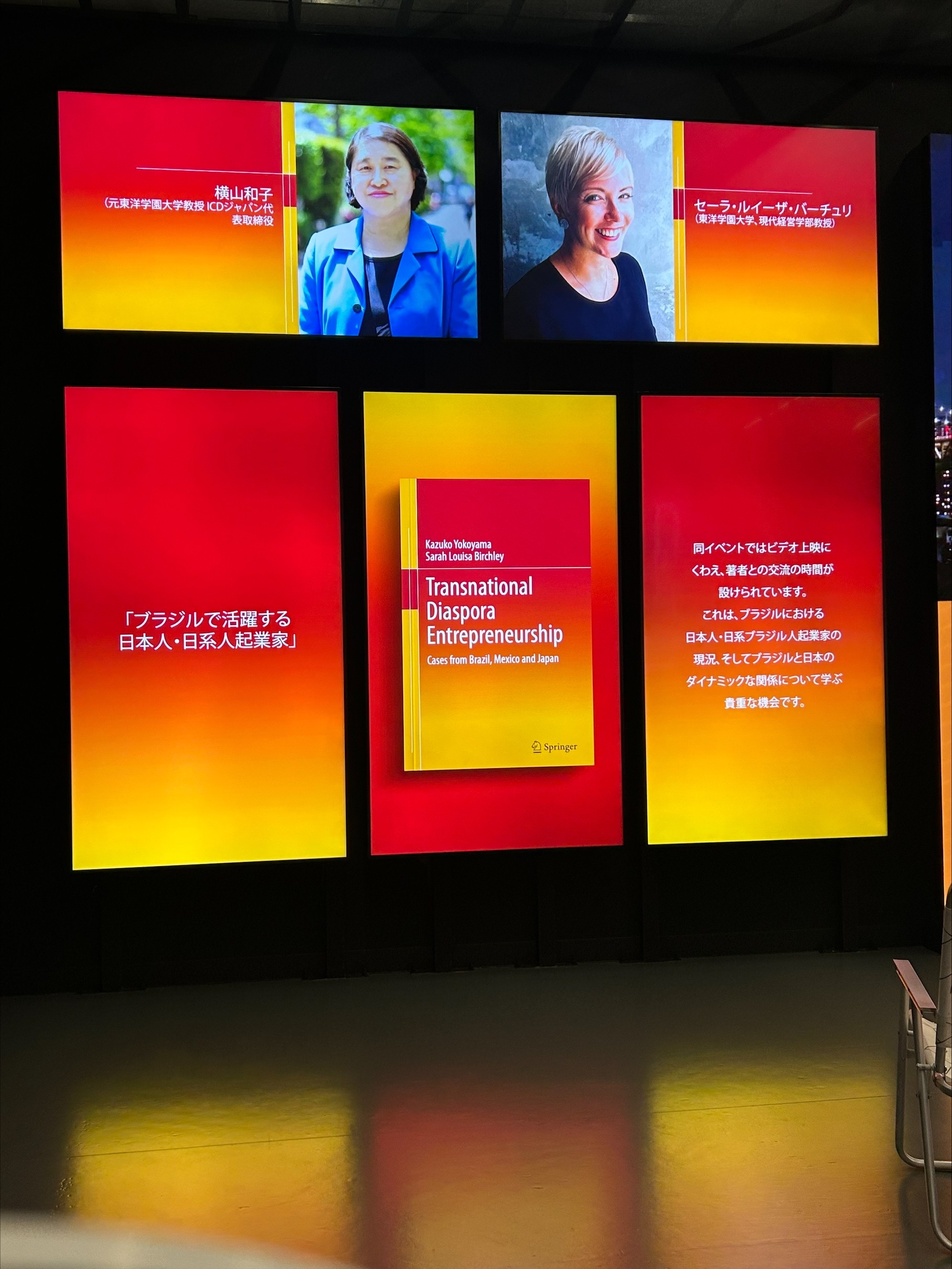 10月3日(金)、大阪・関西万博のブラジル館で、現代経営学部のセーラ・ルイーザ・バーチュリ教授と、同学部の元教授である横山和子氏による共著『日系・トランスナショナル起業家研究―ブラジル、メキシコ、日本の事例から(Transnational Diaspora Entrepreneurship: Cases from Brazil, Mexico and Japan)』の出版記念イベントが開催されました。横山和子氏は現在はICDジャパン(International Career Development社)の代表取締役を務めています。