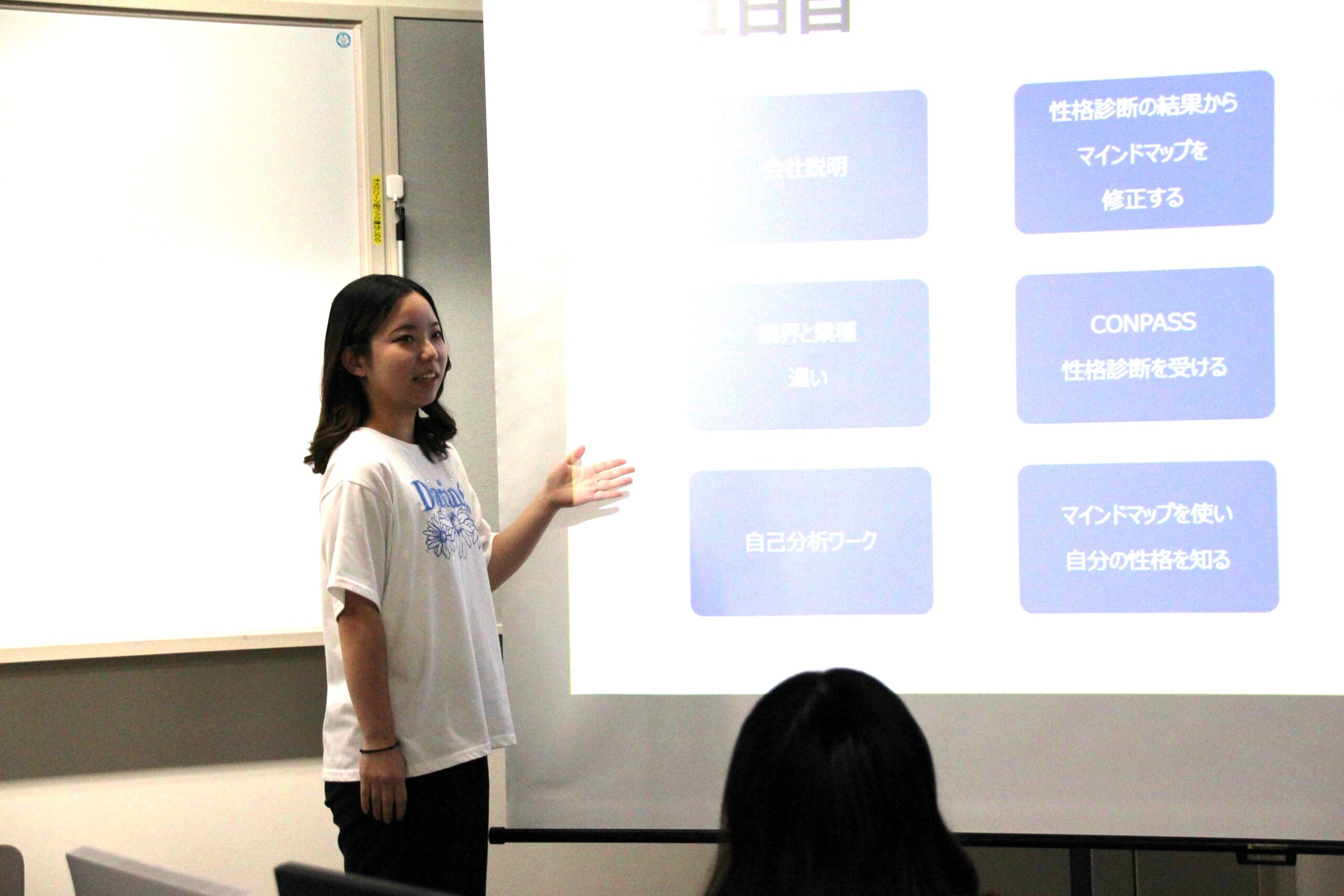 最初に発表した山中彩華璃さんは、株式会社バリュースタッフで5日間のインターンシップに参加。人材派遣業界とホテル業界の両方を学び、営業体験やコーディネーター体験、実際のホテル見学などを通じて、業界理解を深めました。「気になる業界を絞ることができた」と今後の就職活動への意欲を語りました。