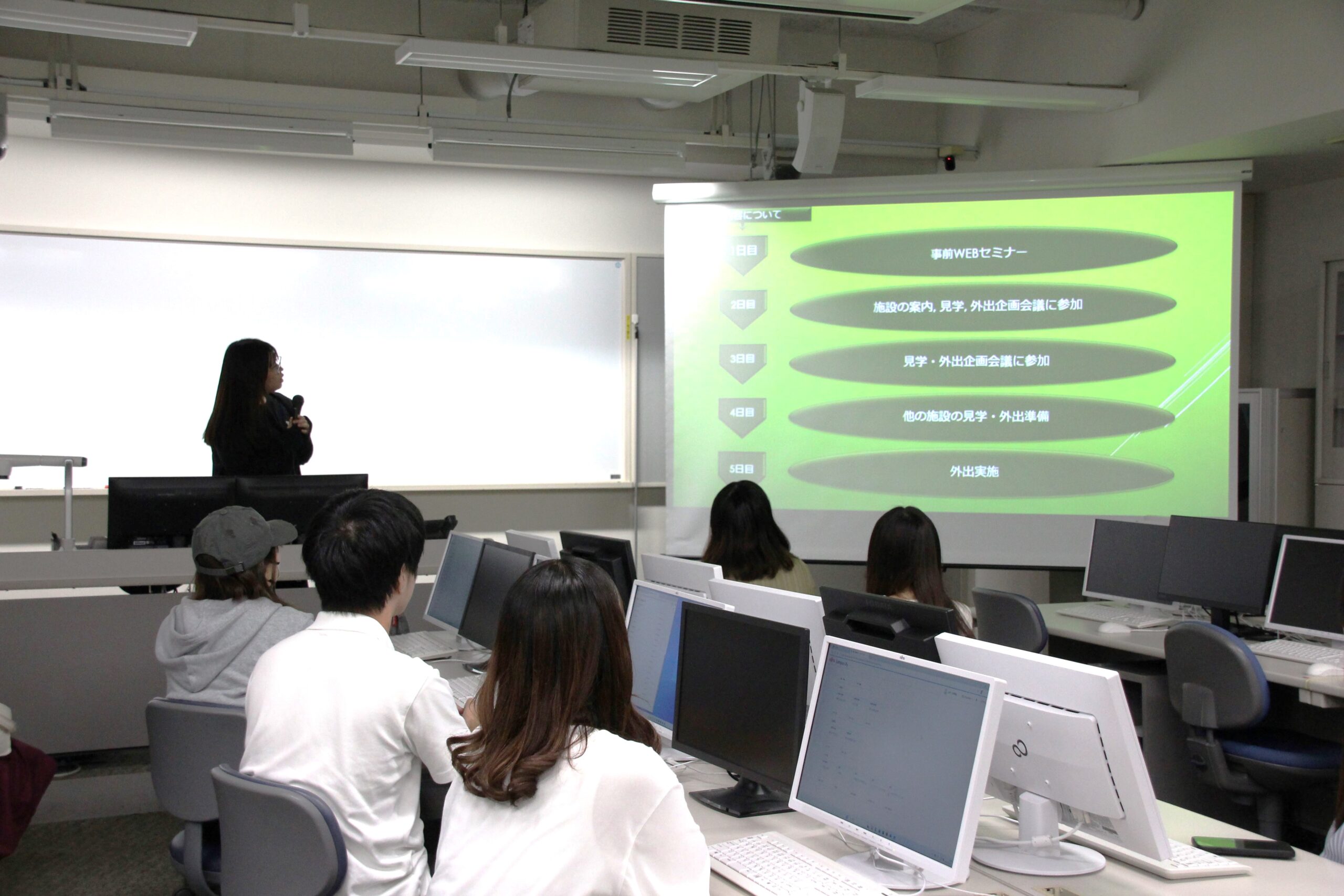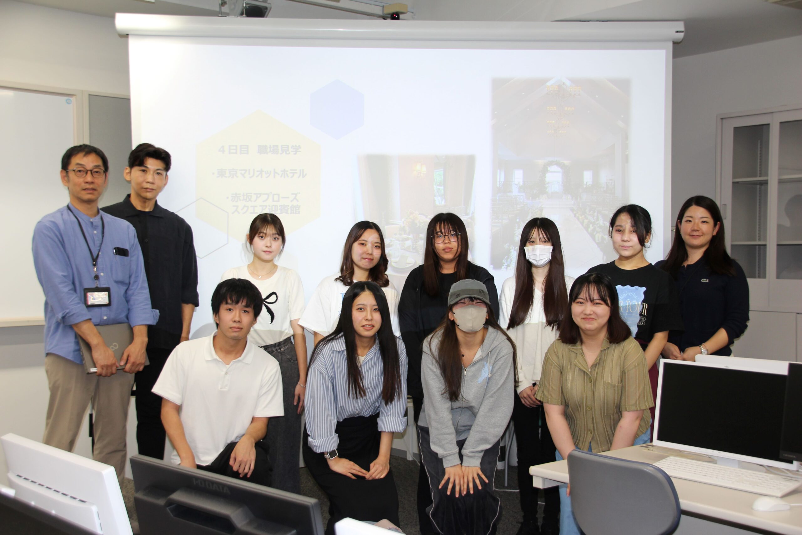 インターンシップにはゼミ生全員が参加しましたが、この日の報告会では、ホテル業、人材業、福祉・介護業、美容業などを経験した学生4名が発表を行いました。