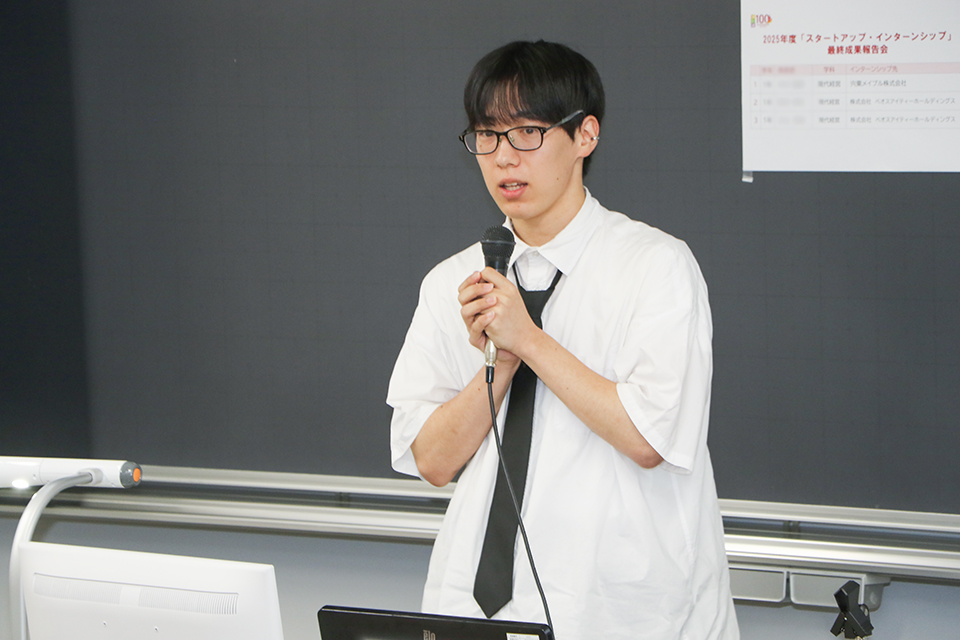 次に登壇した現代経営学部1年の岡安さん、最後に登壇した三上さんは、株式会社ベオスアイティホールディングスでの5日間のインターンシップに参加。