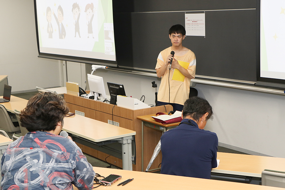 まず初めに報告を行ったのは、兵庫県宍粟市にある「道の駅みなみ波賀」(宍粟メイプル株式会社)でのインターンシップに挑戦した現代経営学部1年の中川さん。