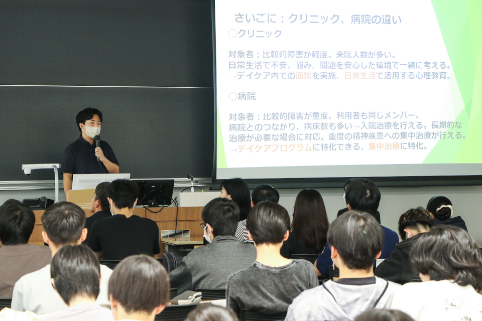 次は、医療分野の中から、駅前にある通院型のメンタルクリニックと、病床数が多く、重症患者も多く受け入れている精神科の病院という2施設で実習を行い、QOL向上プログラムの見学も行った学生が発表。