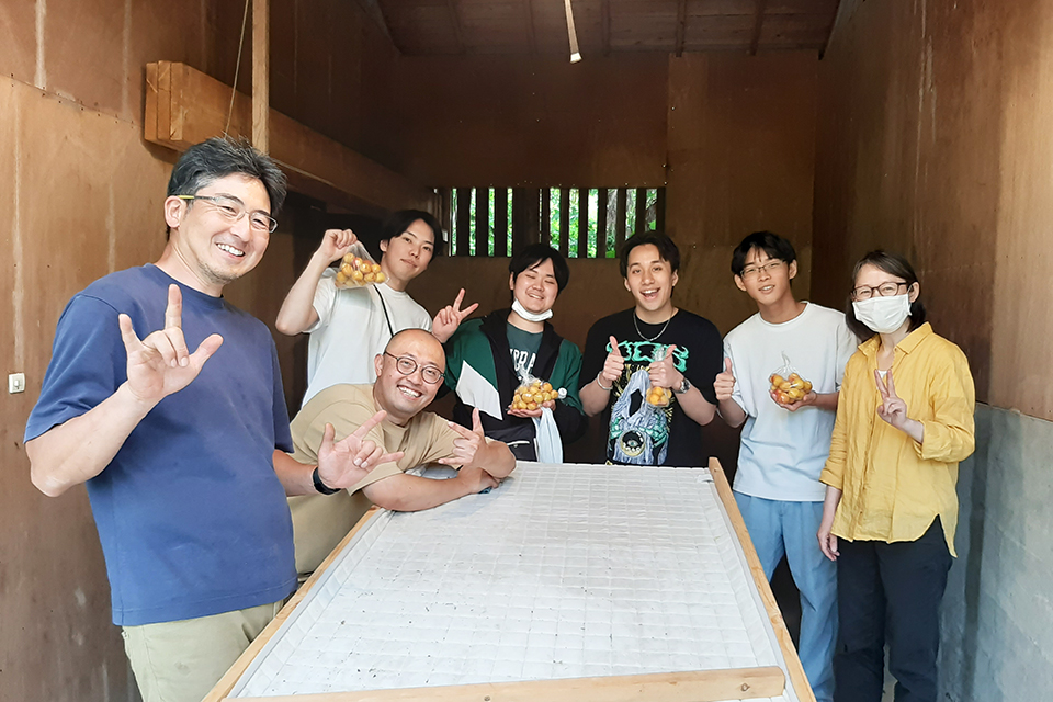 梅の実一つひとつを手作業で丁寧に収穫・選別するゼミ生たち