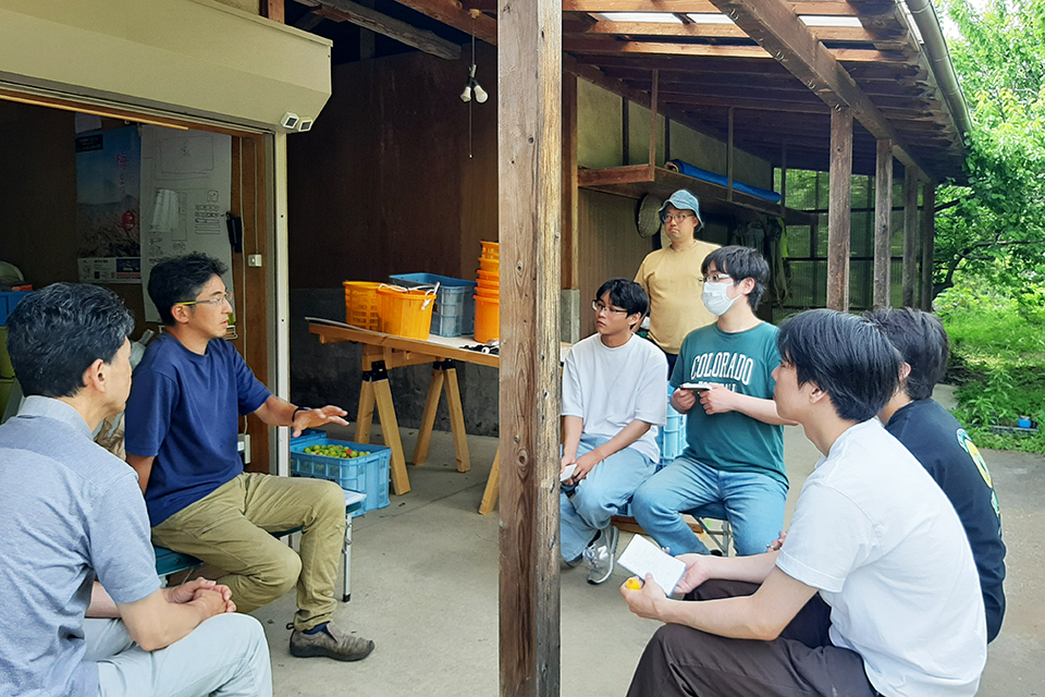 現地到着後、ゼミ生たちは大手企業のエンジニアから梅農家に転身した平澤氏に、梅農業の現状や抱えている課題について詳細なヒアリングを実施。