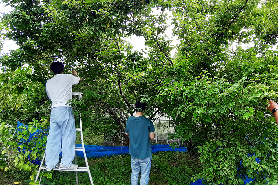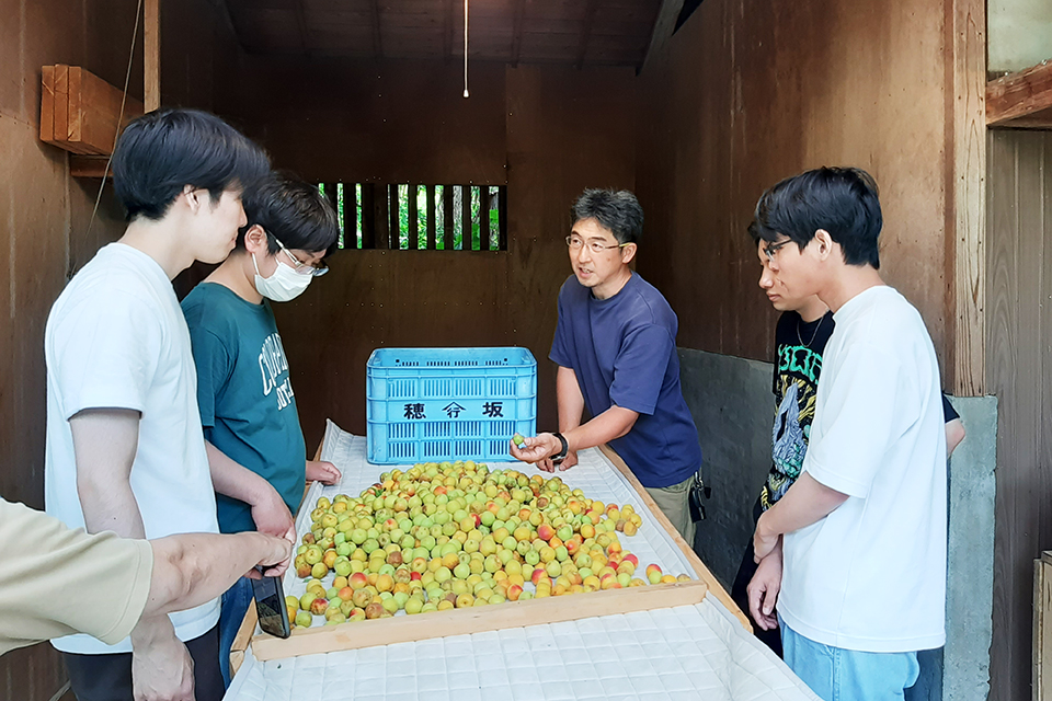 「梅農園での現地調査では、実際に梅農家の方からお話を伺うことができました。収穫の手間や価格の不安定さ、それに伴う収入の不安定さなど、梅農家の経営が非常に厳しい状況にあることを知りました。(略)梅農業が直面している課題への理解が深まり、自分たちにできる事や情報発信の大切さについて考える貴重な機会になりました」