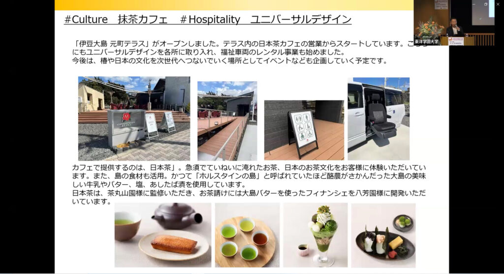 そして、椿の島・伊豆大島の再構築を目指して「伊豆大島つばき座」というプロジェクトを立ち上げ、(Nature+Culture)×Hospitalityをテーマに里山の再生やアンコ文化保存の支援、ユニバーサルデザインを取り入れた日本茶カフェの新設など、幅広い活動を行っているという説明がありました。