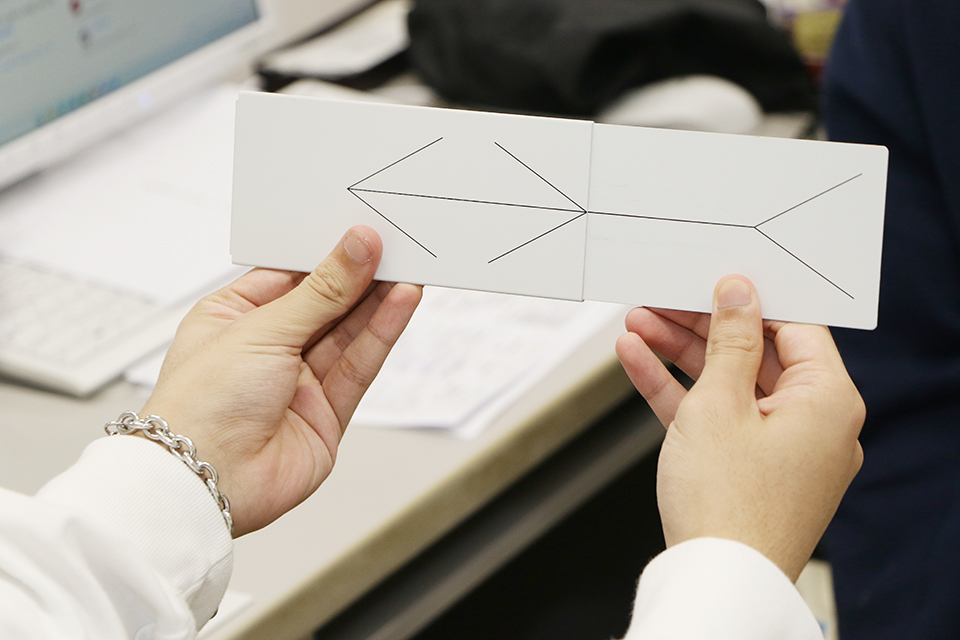 「錯視知覚(ミュラー・リヤー錯視)」では、様々な長さや角度の矢印が描かれた器具を使って、矢印の長さや角度の違いによって、横棒の長さの見え方(騙され方)にどのような変化が生じるかについての数値データを収集。