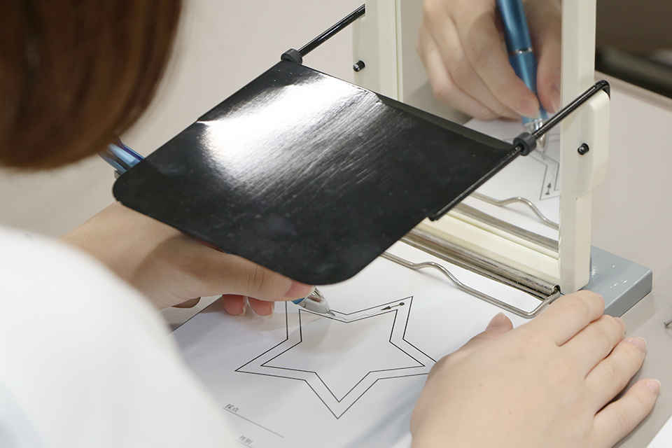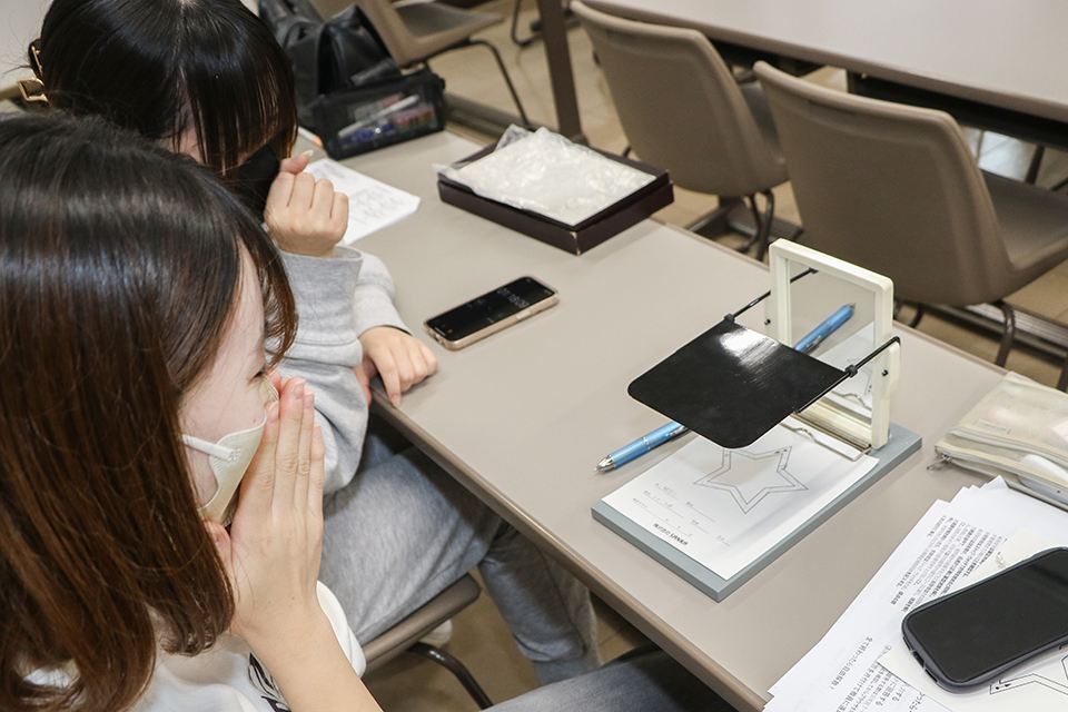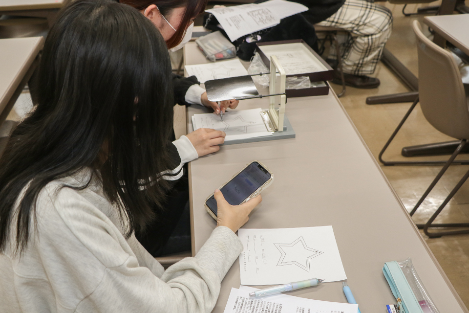 また、別のクラスで行われていた「知覚運動学習(鏡映描写)」は、鏡に映った手元の像だけを見ながら星形の狭い道をはみ出ないように1周し、かかった時間とはみ出した回数を記録するという、こちらも一見簡単そうに思える実験。