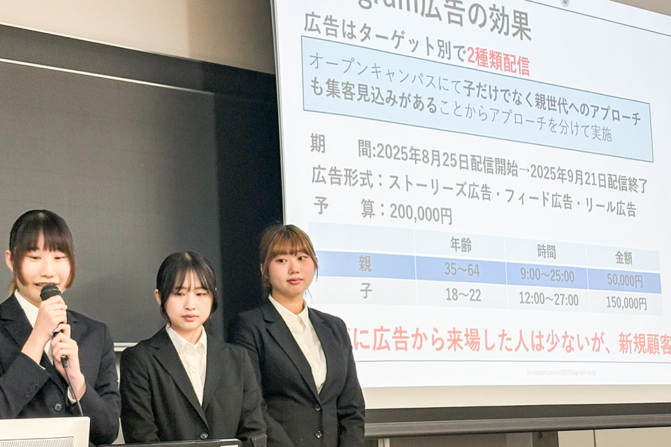 インスタ広告の投資対効果について説明する広報チームの今宿美咲さん(左)由田渚咲さん(中央)渡邊愛優さん(左)