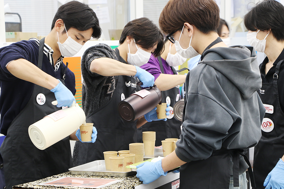 また、「カフェ」をモチーフにしたイベントということで、会場では「環境に配慮したカップ」(再生紙製)でゼミ生が選んだ温かい飲み物を提供。
