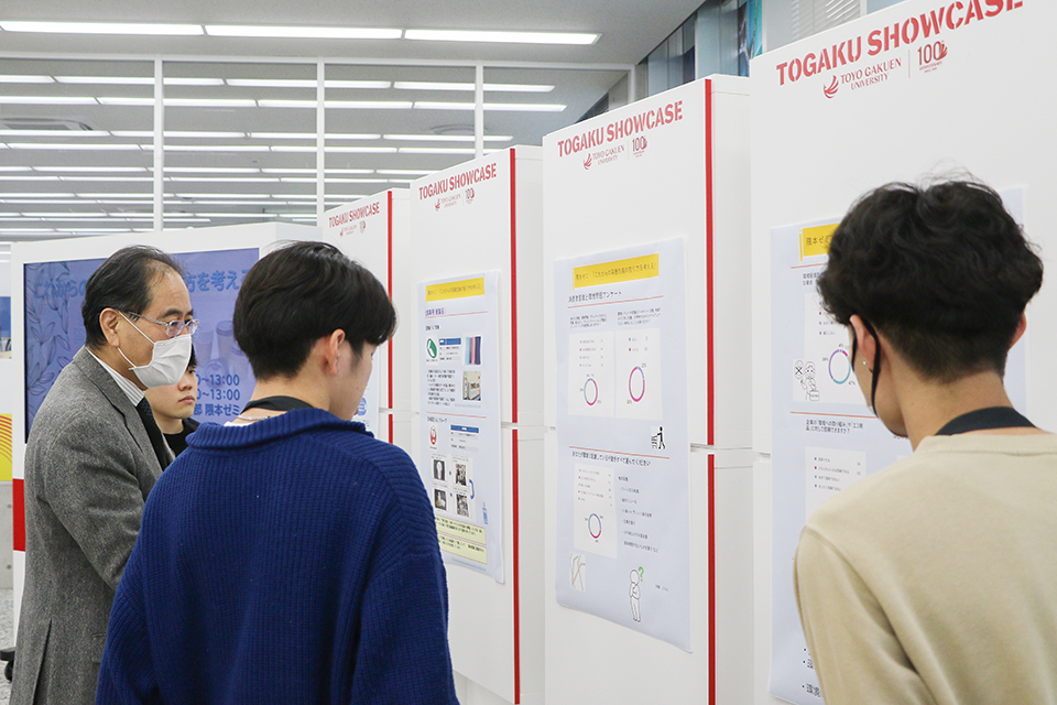 会場となった1号館1階の「TOGAKU SHOWCASE」には、隈本ゼミの研究成果をまとめたポスター展示が。