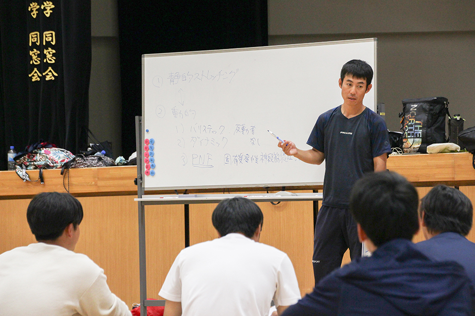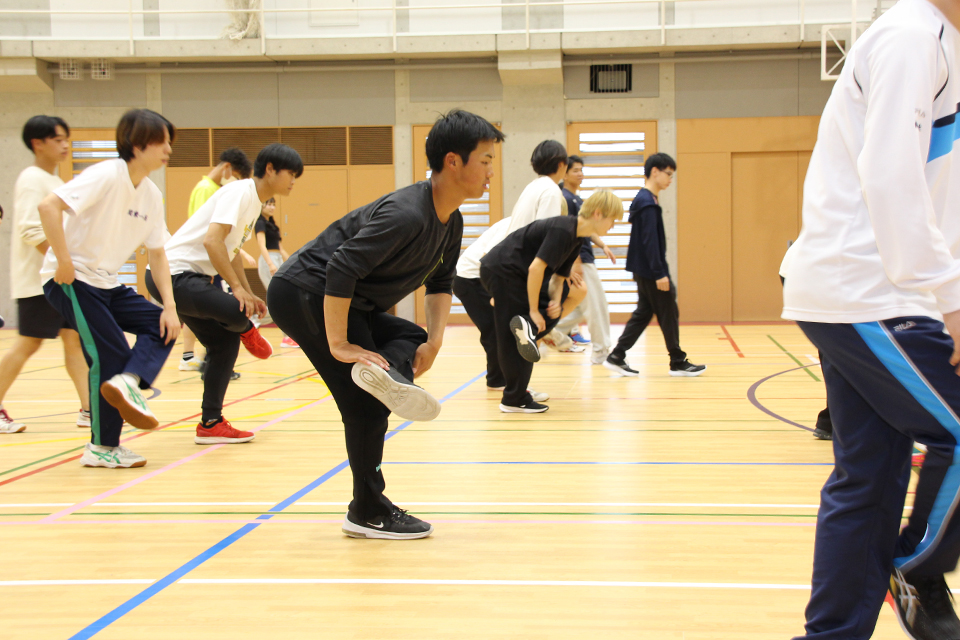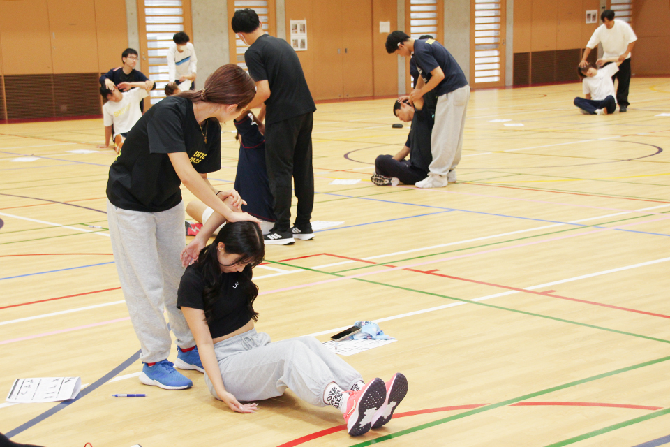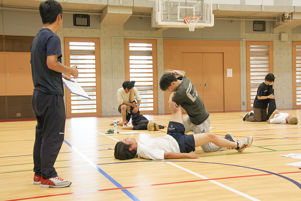体育館では、静的・動的なストレッチ、パートナーストレッチング、PNFストレッチングといった様々なストレッチングを実践しながら学習。