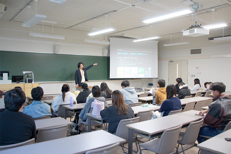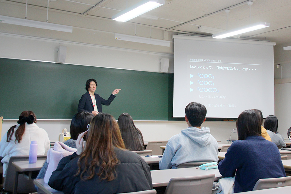 人間科学部の「地域ではたらく」(宮園久栄特任教授)では、公務員やNPO、福祉や司法など様々な領域で活躍する人々をゲスト講師に迎え、地域を支える仕事について学びます。