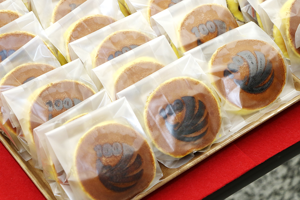 和菓子の中には、ゼミ生たちが「東洋学園100周年」にちなんでデザインした特製のどら焼きも。