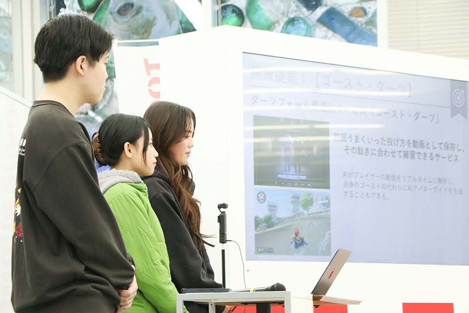 最終プレゼンテーションでは、ゲストとして(株)ダーツライブよりサービス事業本部・長嶋宣幸氏ら3名を招き、全4チームが研究成果を発表しました。