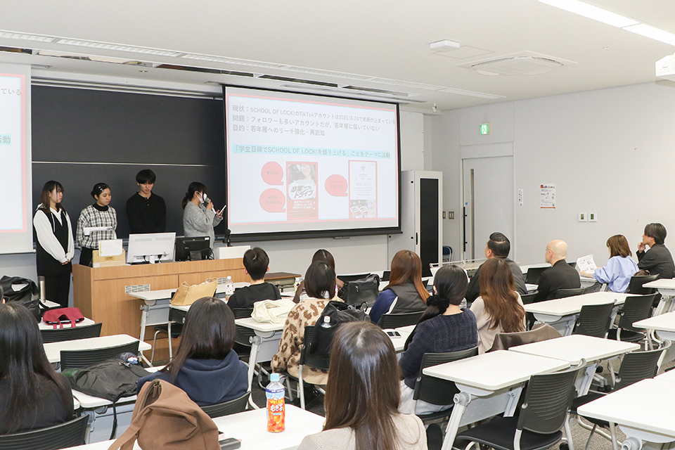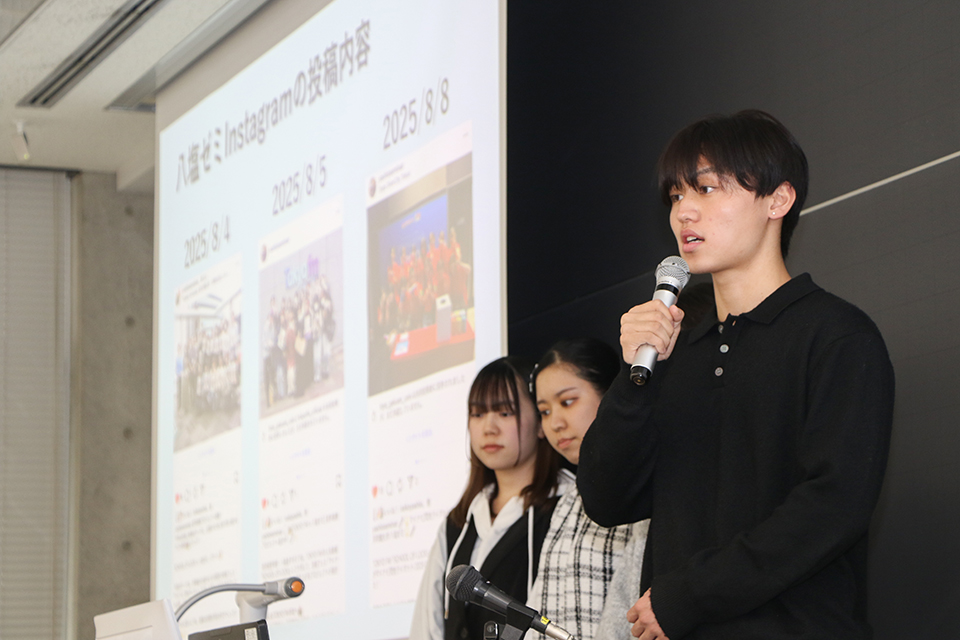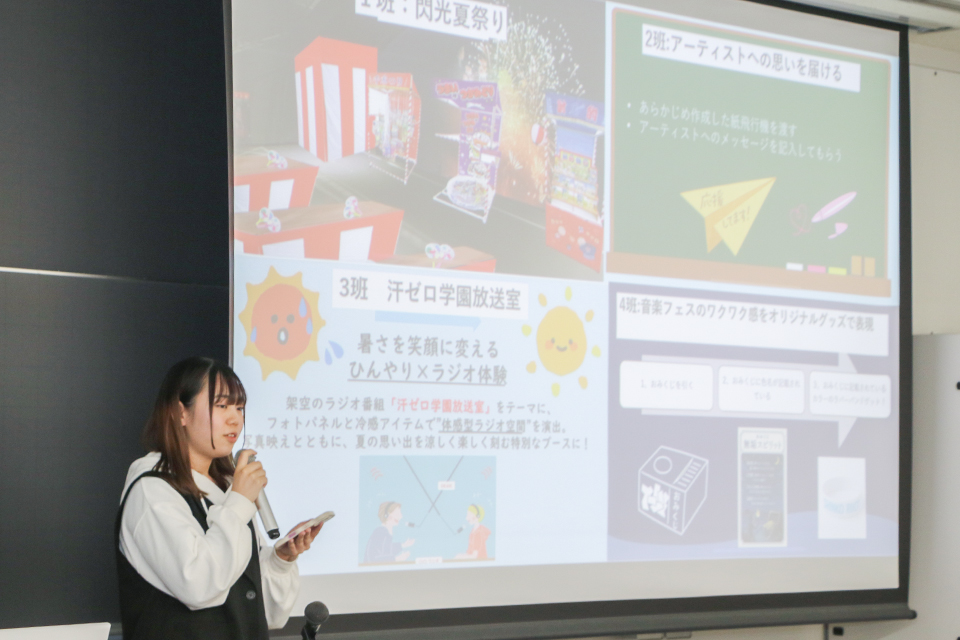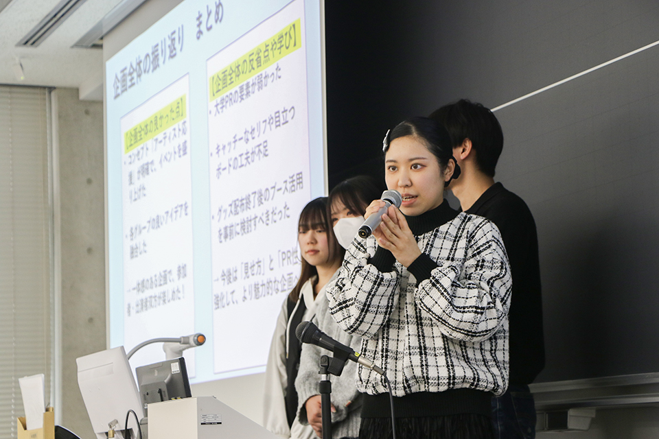 最終プレゼンでは、企画提案から当日までの流れとゼミ生の提案内容、最終的なイベント企画全体を振り返ったうえで、現場での運営結果を発表。