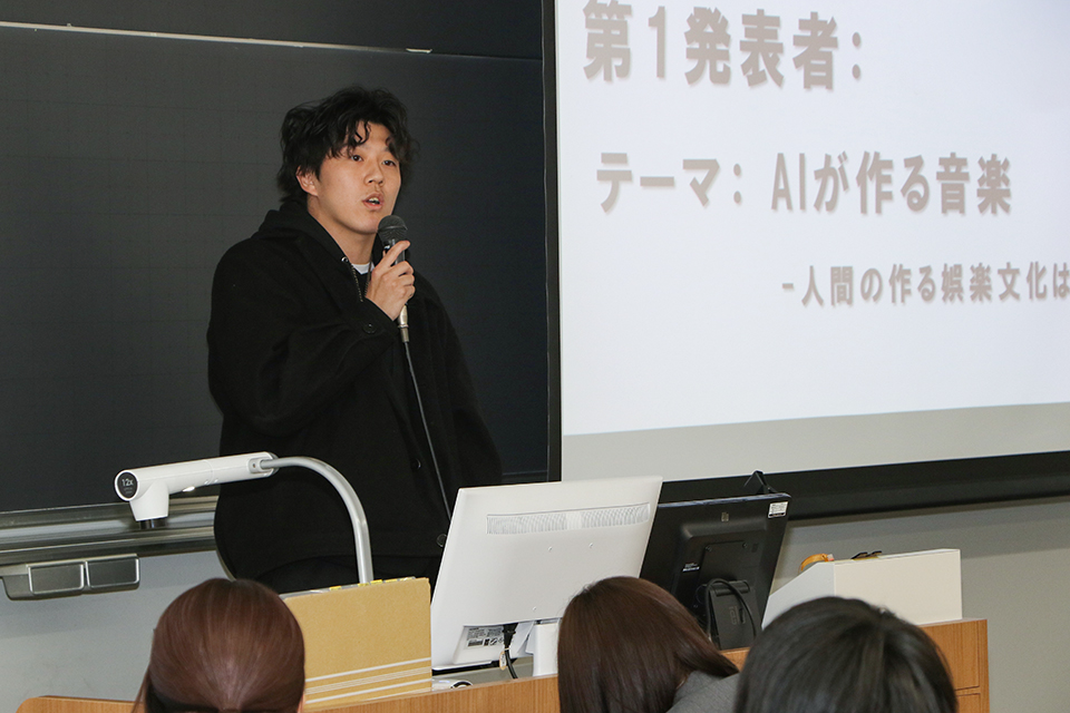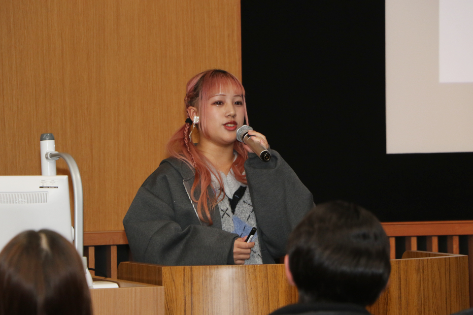 12/18(木)2限に開催されたグローバル・コミュニケーション学部の全体会では、「自分の好きなこと」を学びに繋げたプレゼンテーションが並び、学生一人ひとりの個性が際立っていました。