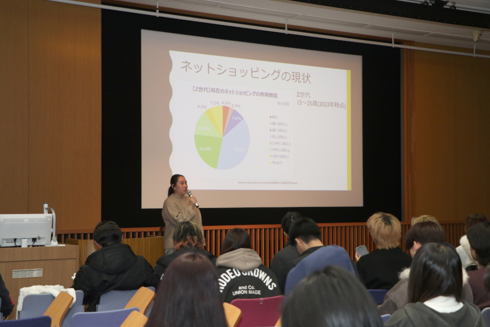 若者の消費行動を企業の視点から分析した発表や、外国人観光客に関する実態をデータで検証した発表、口コミの信頼性を考察した発表などもあり、社会の実態を多角的に捉える発表が続きました。