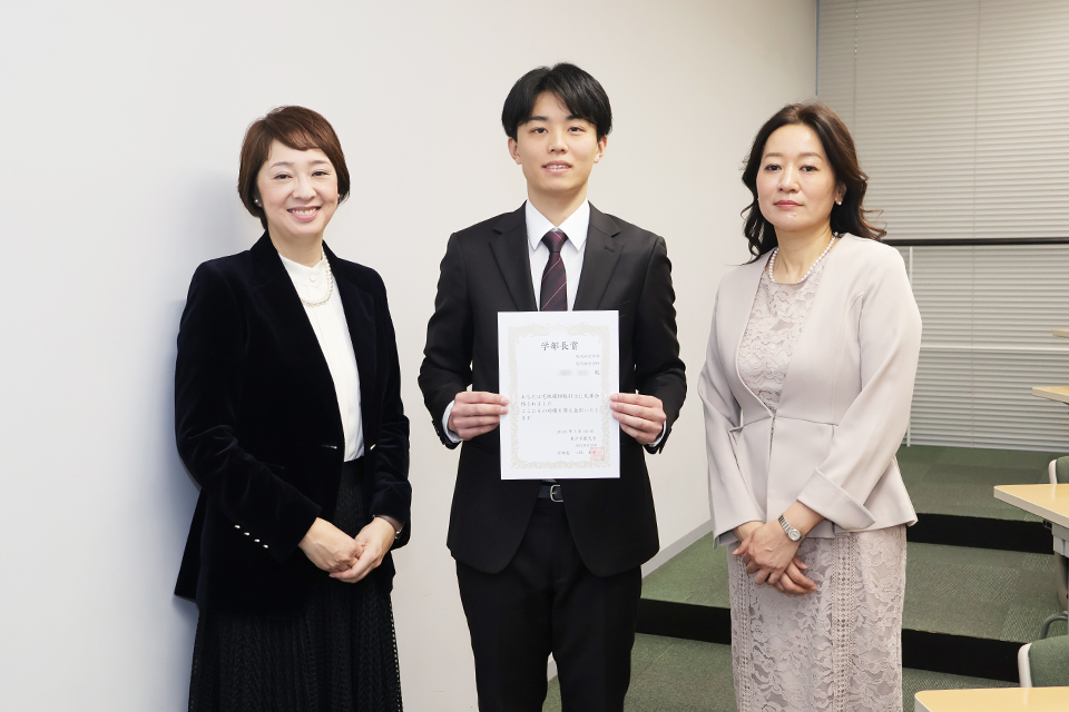 宅地建物取引士の資格を取得した現代経営学部4年の櫻井陽太さんに、同学部の八塩圭子学部長より表彰状と副賞が贈られました。
