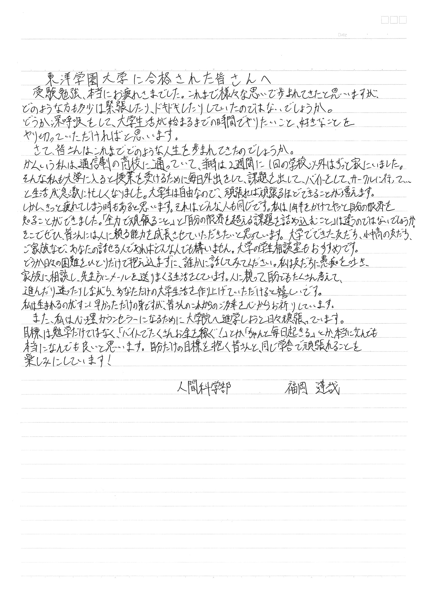 奨学生として採用され、「採用決定通知書」がお手元に到着したら、【進学先提出用】と書いてあるページを専用URLにアップロードしてください。(お手元にある「入学生案内」p.4のCをご確認ください。)