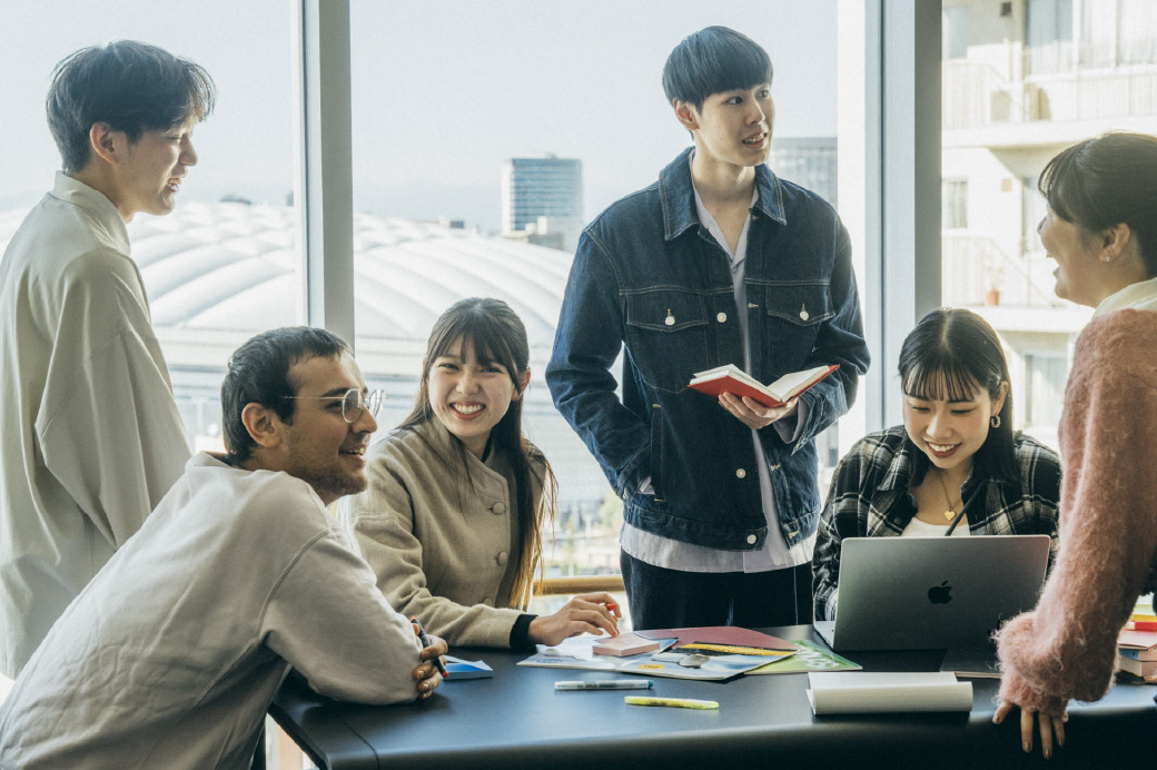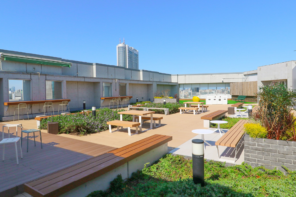 2024年春、1号館の屋上がリニューアル。在学生の意見を反映し、SDGsにも配慮した多目的スペースが誕生しました。眺めの良い人工芝エリア、ウッドデッキのステージ、テーブル席のほか、充電スポットのあるカウンター席も。