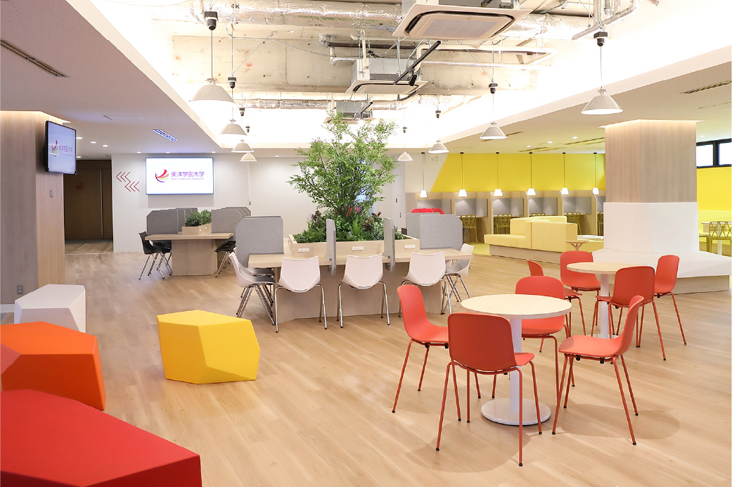 自習ブースやテーブル席、大学からの情報掲示板などが備えられた、4・5号館エントランス。名前はリニューアル当時の在学生が命名。大学ロゴのカラーをモチーフにしたカラフルなデザイン空間で、あなたの“居場所”がきっと見つかります。
